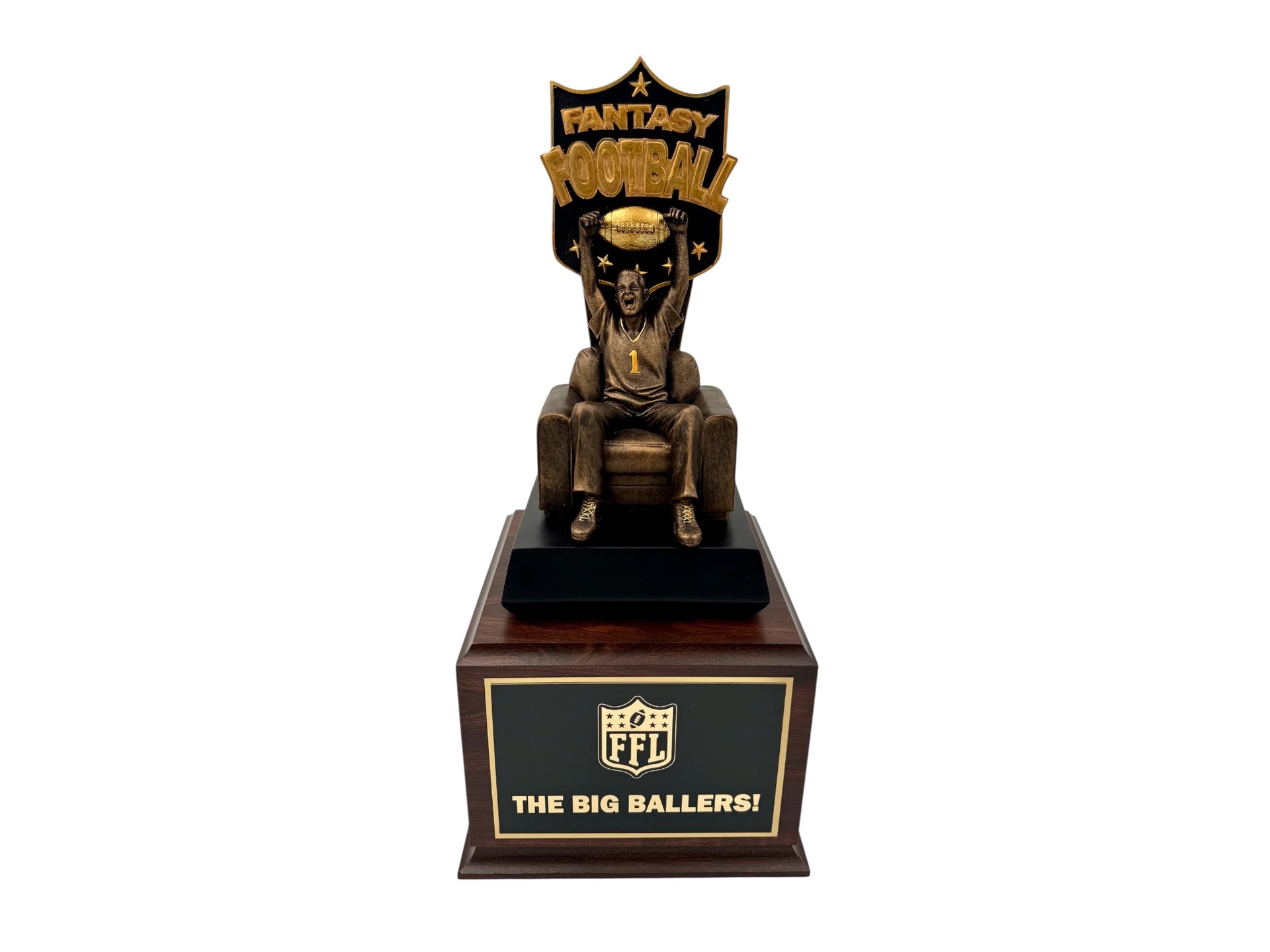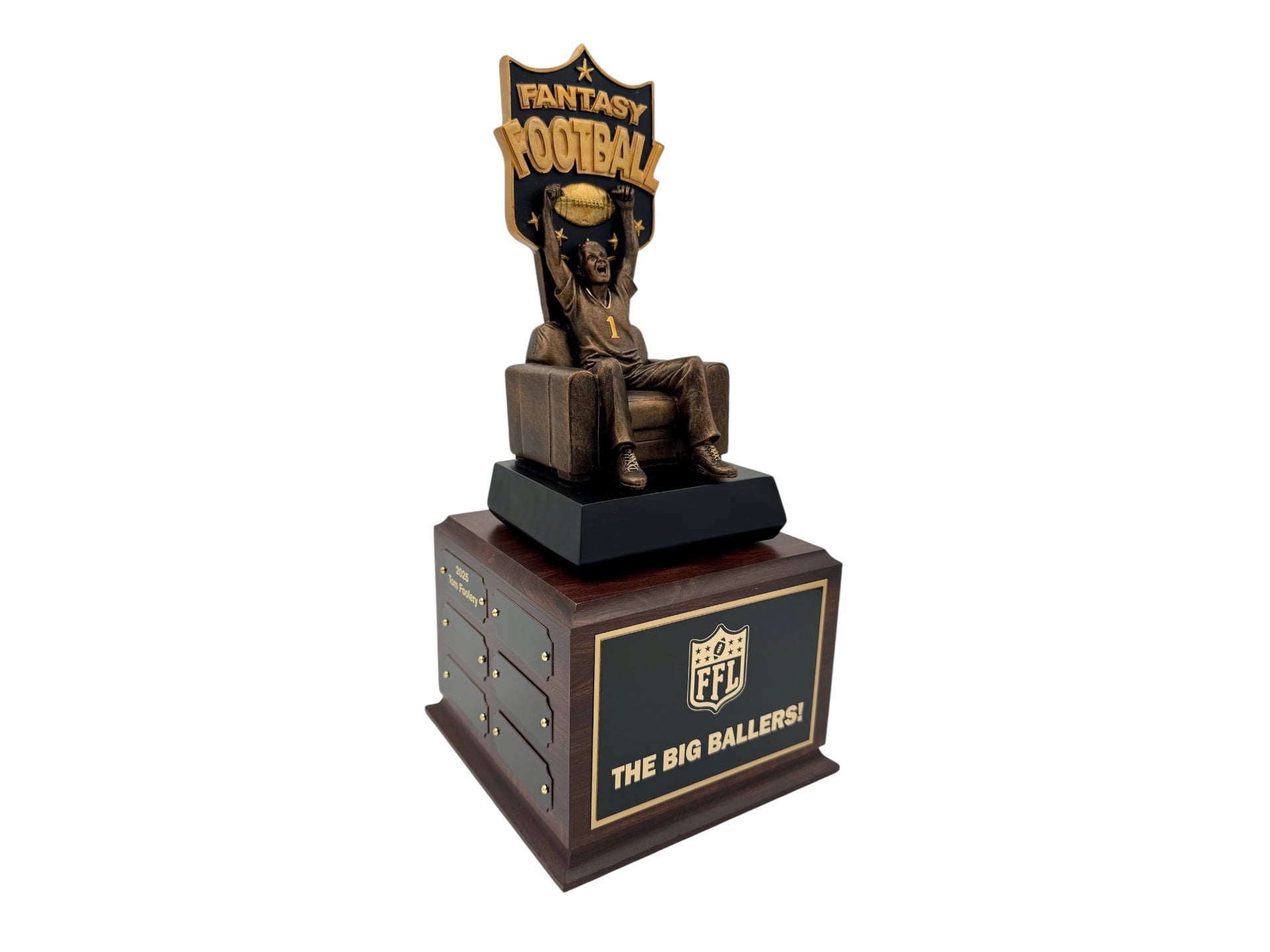 Now that’s a trophy with personality. A fantasy football perpetual plate trophy topped with a guy in an armchair is the perfect blend of glory and comedy—it’s like the Heisman for couch coaches.